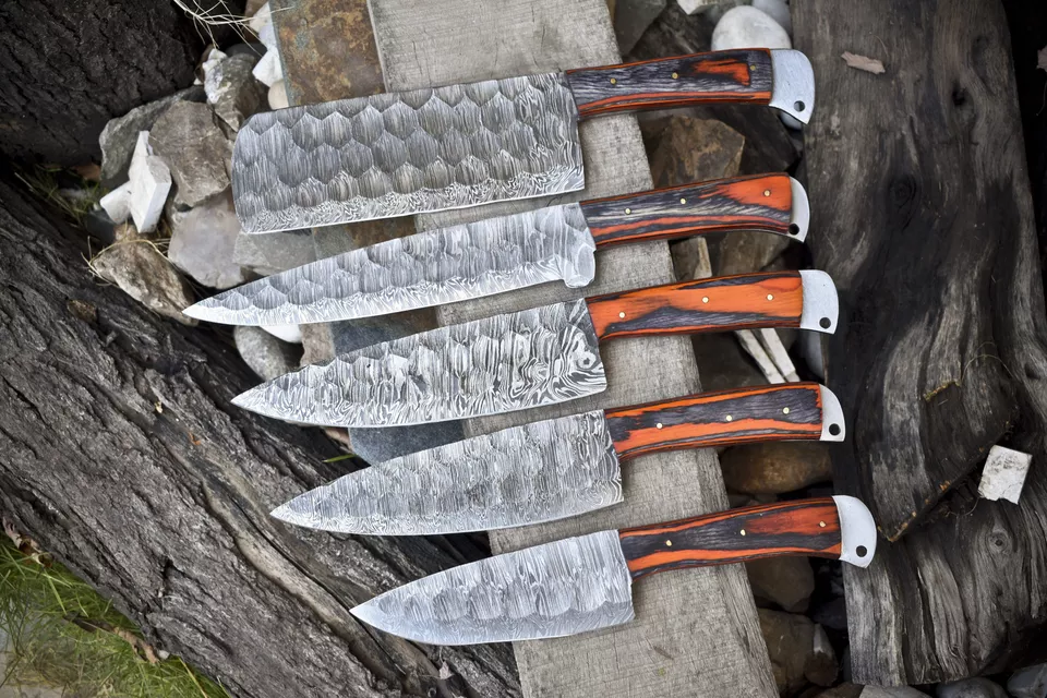 002-05 Chef Knife Set 24 Damascus Hammered Effect 5 Pieces Hardwood Red Grey Grain