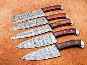 004-05 Chef Knife Set 45 Damascus Hardwood 5 Piece Hardwood Hammered Effect