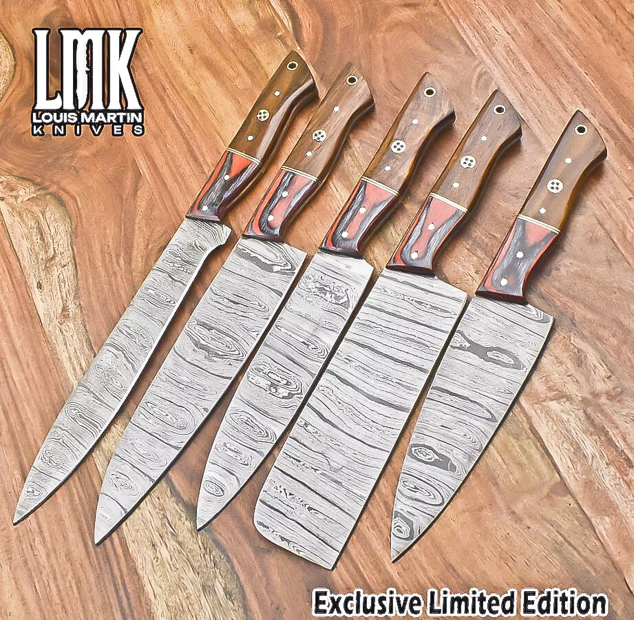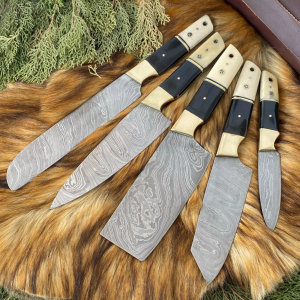 The Chef’s Knives are multi-purpose kitchen knives, typically 8 inches long, constructed of stainless steel and carbon steel. Damascus is a mixture of 1095 and 15N20. The steel is heated and then folded over and over to get the desired layers. The blade is burned in acid, which turns the layers into different colors. The layering process also results in a more complex and more durable blade than a single type of steel. The twist pattern in this Damascus steel is a stunning display of motion and energy, with the swirling lines creating a sense of movement and fluidity across the surface of the steel. The pattern is bold and striking, with each twist perfectly formed and polished to a high shine. The colors of the pattern range from deep black to bright silver, creating a captivating contrast that catches the eye. The twist pattern adds depth and dimension to the steel, giving it a unique, dynamic, modern, and timeless look.