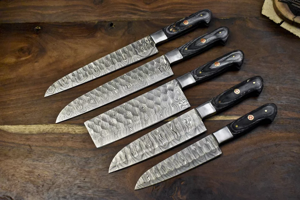 The Chefs Knives are multi-purpose kitchen knives, typically 8 inches long, constructed of stainless steel and carbon steel. Damascus is a mixture of 1095 and 15N20. The steel is heated and then folded over and over to get the desired layers. The blade is burned in acid, which turns the layers into different colors. The layering process also results in a blade that is harder and more durable than a single type of steel. The twist pattern in this Damascus steel is a stunning display of motion and energy, with the swirling lines creating a sense of movement and fluidity across the surface of the steel. The pattern is bold and striking, with each twist perfectly formed and polished to a high shine. The colors of the pattern range from deep black to bright silvers, creating a captivating contrast that catches the eye. The twist pattern adds depth and dimension to the steel, giving it a unique and dynamic modern and timeless look.
