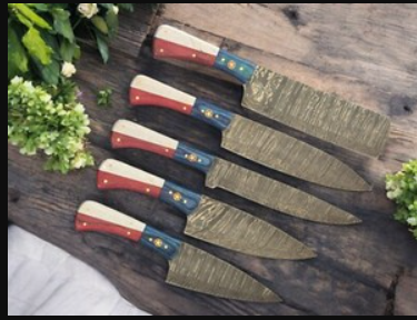 Damascus Patriot Chef Set w/Red, White and Blue Hardwood Handle