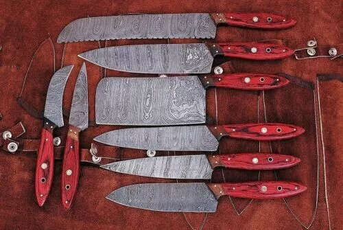 This beautiful 8 piece chef Knife set features beautiful damacus patterns, olives handles and an amazing custom leather roll bag.