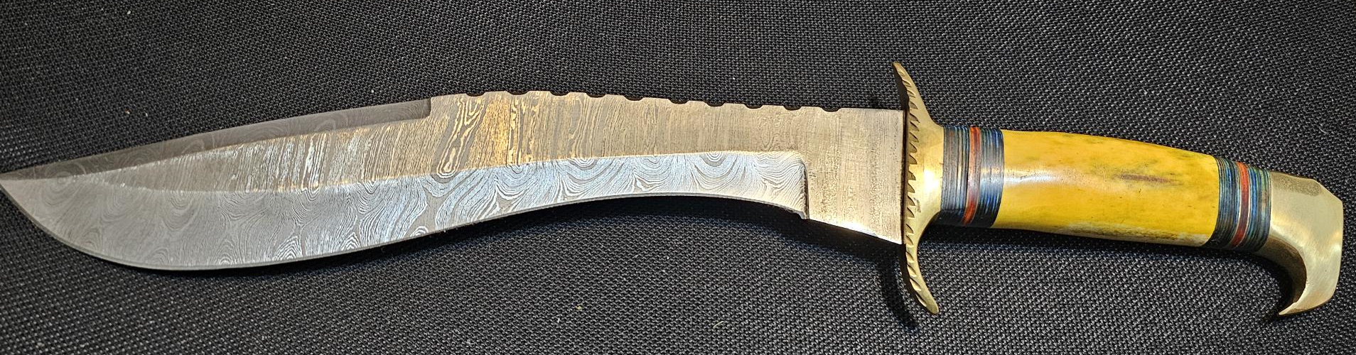 Our blades, meticulously crafted from high-quality Damascus steel, are custom-made to ensure your hunting needs are met. The blade of this hunting knife is the result of the saw-blade effect at a microscopic level, a feature that guarantees its longevity. While other blades may have dulled, this one keeps cutting, ensuring a reliable and consistent performance. The Blade of this knife is 1095 and 15N20 high steel true layers (512). It has undergone excellent heat treatment, resulting in a rock well hardness of the blade along its edge at 50 to 54 and along the spine at 42-45. The spine of the blade tang features exquisite file work, adding to its durability. The superb-looking handle of this Unique Hunting knife is made of Beautiful Stained camel bone and hardwood, with brass spacers and a hand-cast brass bolster.