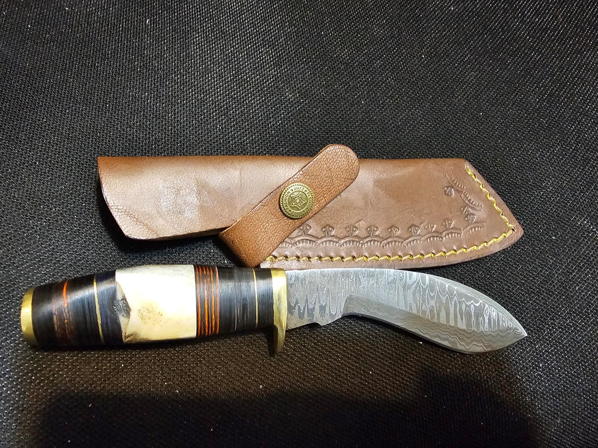 Kukri-style hunting skinner is used for tracing, skinning, wood cutting, wood carving, and other tasks, which can all be accomplished with a hunting skinner knife. Hunting Skinner knives are used by hunters, hikers, and outdoor sports enthusiasts. The Damascus blade is a testament to the art of forging. A blend of 1095 and 15N20 is meticulously heated, folded, and layered to create a unique, multicolored pattern. This layering process not only enhances the blade?s aesthetics but also its strength and durability, surpassing that of a single type of steel. A Stag Antler Handle is a visually captivating and durable material sourced from naturally shed stag antlers. It provides an organic, textured grip and an authentic, rustic character. The ladder pattern in this Damascus steel is an exquisite display of precision and elegance. The alternating bands of metal create a ladder-like effect, with each rung perfectly formed and polished to a mirror-like finish. The pattern is clean and crisp, with sharp lines that catch the light in a dazzling display. The ladder pattern adds depth and texture to the steel, giving it a sophisticated and refined look that is both understated and striking.