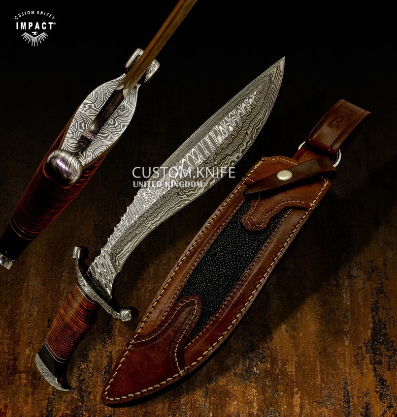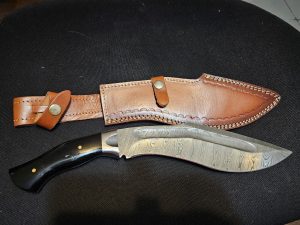 This beautiful custom kukri knife has stunning looks and robust construction, with its 5.50 mm thick blade going all the way inside the handle without any joint or weld. The knife comes with a Certificate of Authenticity, Impact Lifetime Warranty card, and business card. The billet for this blade was folded five times, starting from 9 layers Of 1095 and 15N20, giving approximately 288 layers in this fabulous pattern. The fantastic Damascus blade of the knife is the result of hours and hours of forging. Not many custom makers can keep such a pattern of layers upon layers flowing all the way to the edge of the blade, which creates a saw-blade effect at the microscopic level, allowing the blade to keep cutting while other blades have dulled. The blade was given excellent heat treatment and good edge holding and retention for relentless performance. The blade has fantastic hand grinds on both sides, with the top side left with a false edge. The overall length of this Knife is 15.80?, and the size of the blade is 10.65?. Rock solid stacked leather handle feels great and provides excellent grip and hold. A stunning hand-forged Damascus guard compliments the knife.