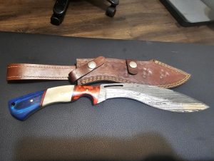 Kukri 36 13 Damascus Bone Wood Red White Blue